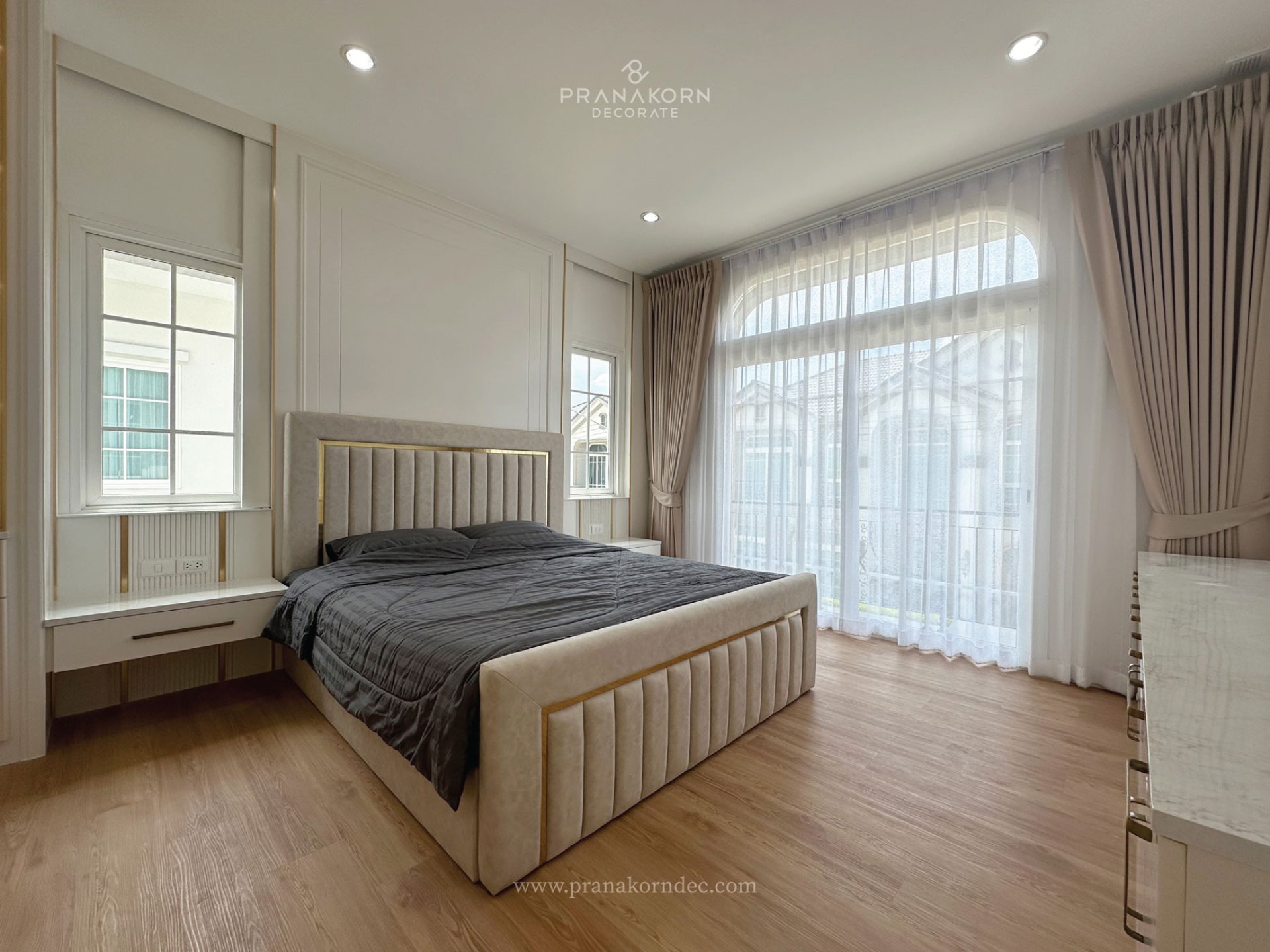- รอยต่อและการจบงาน: การทำบ้านทั้งหลังช่วยให้ดีไซน์เนอร์สามารถคำนวณระยะรอยต่อระหว่างห้องได้แม่นยำ เช่น การซ่อนรางเลื่อนประตู หรือการเชื่อมต่อฝ้าเพดานกับตู้เสื้อผ้าที่ต่อเนื่องกัน ทำให้ภาพรวมของบ้านดูเนียนตาและเป็นอันหนึ่งอันเดียวกันมากกว่า