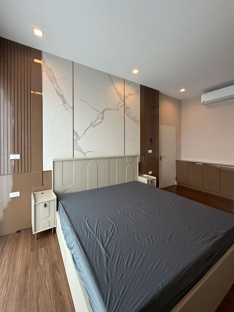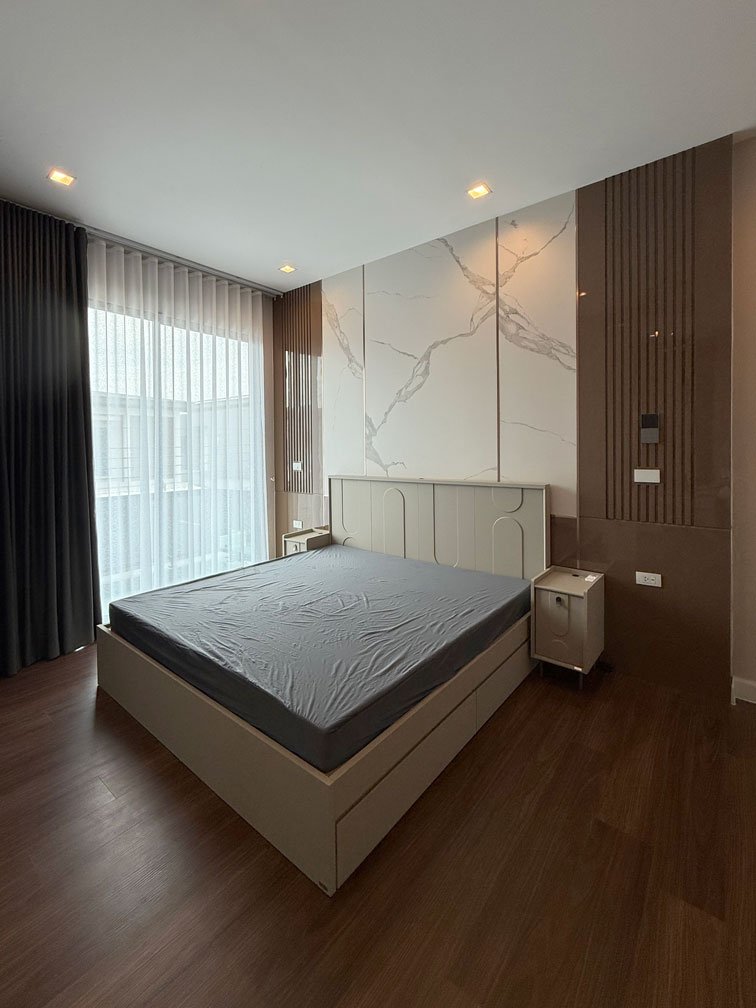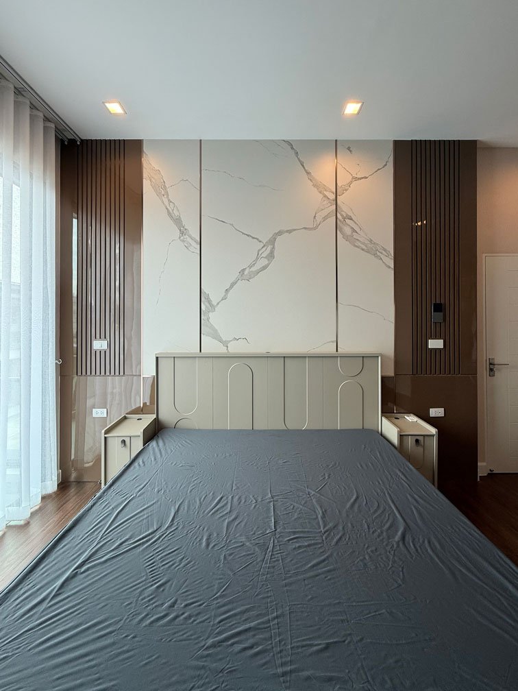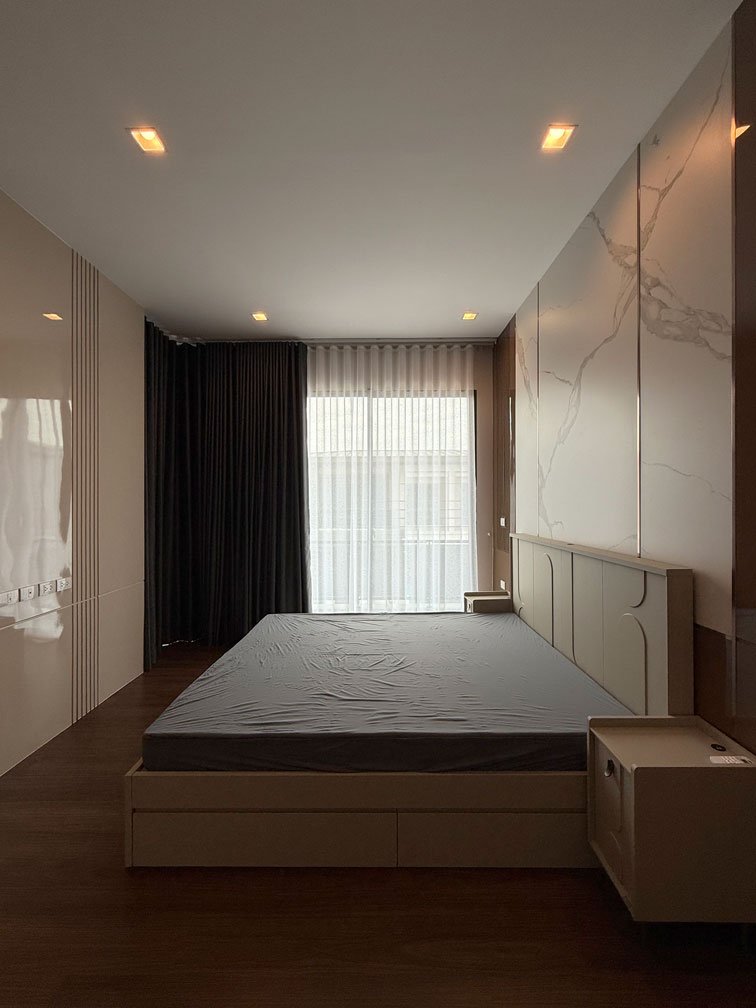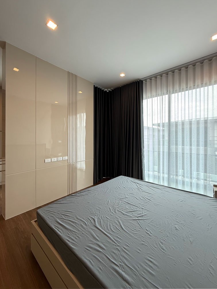 ห้องนอนใหญ่ พื้นที่ค่อนข้างใหญ่ สามารถจัดสรรพื้นที่ได้ทั้งห้องนอน ส่วนทำงาน พื้นที่แต่งตัว และตู้เสื้อผ้าครบจบในห้องเดียว ภายใต้แนวคิดการออกแบบตกแต่งภายในที่เน้นความเป็นสัดส่วนและความเรียบหรู