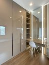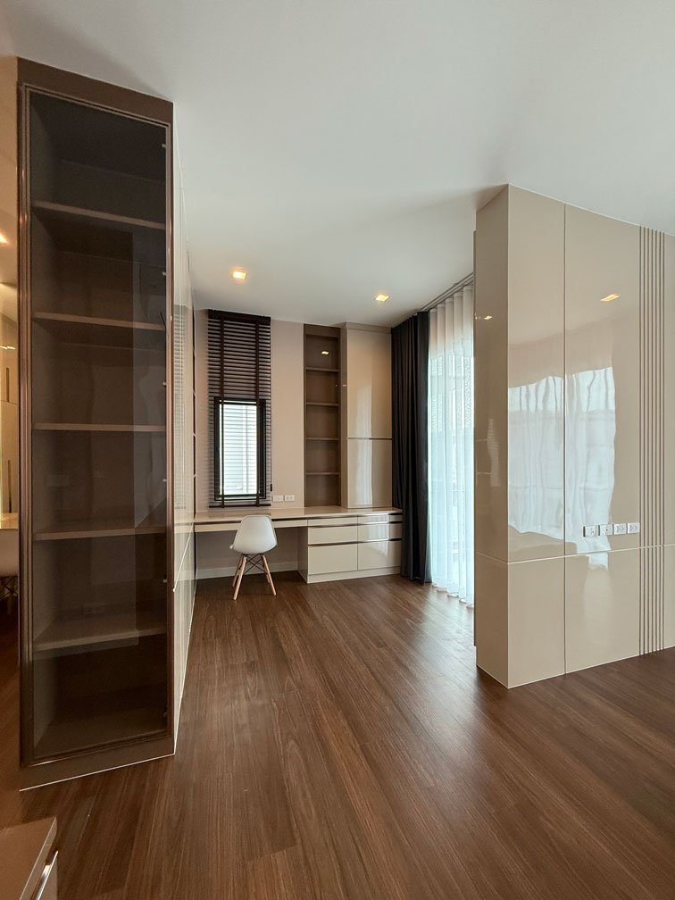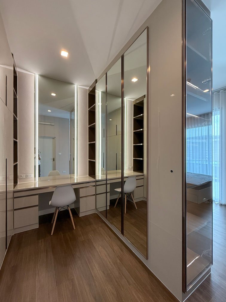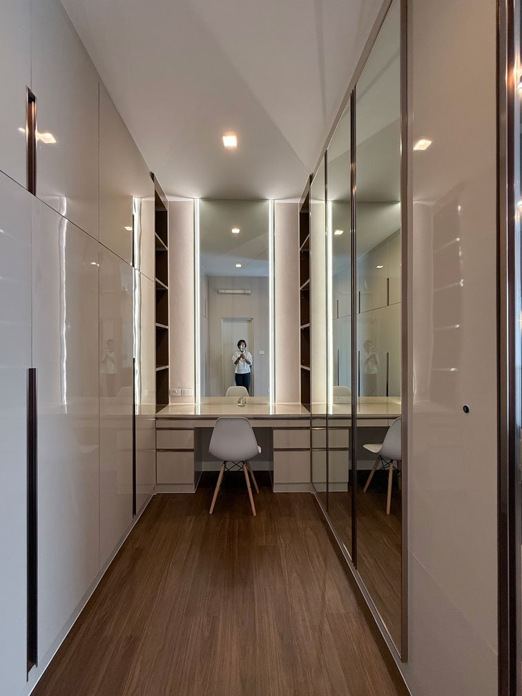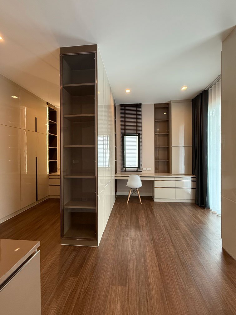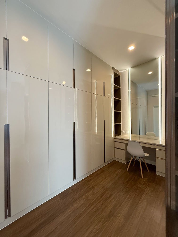 ห้องนอนใหญ่ พื้นที่ค่อนข้างใหญ่ สามารถจัดสรรพื้นที่ได้ทั้งห้องนอน ส่วนทำงาน พื้นที่แต่งตัว และตู้เสื้อผ้าครบจบในห้องเดียว ภายใต้แนวคิดการออกแบบตกแต่งภายในที่เน้นความเป็นสัดส่วนและความเรียบหรู