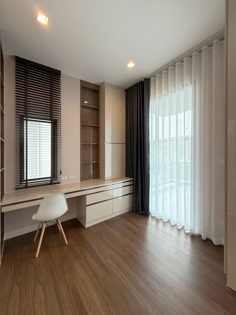 ห้องนอนผู้สูงอายุถูกปรับเปลี่ยนเป็นพื้นที่ทำการบ้านและเรียนหนังสือของเด็กๆ ภายใต้แนวคิดการออกแบบตกแต่งภายในที่เน้นความโปร่งโล่ง พร้อมตอบโจทย์การใช้งานอย่างลงตัวและเป็นสัดส่วน